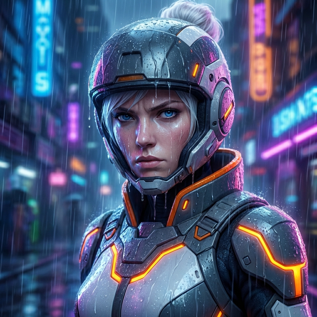 [Image URL] cinematic shot of the character running through a neon city, raining, dynamic action pose --iw 2