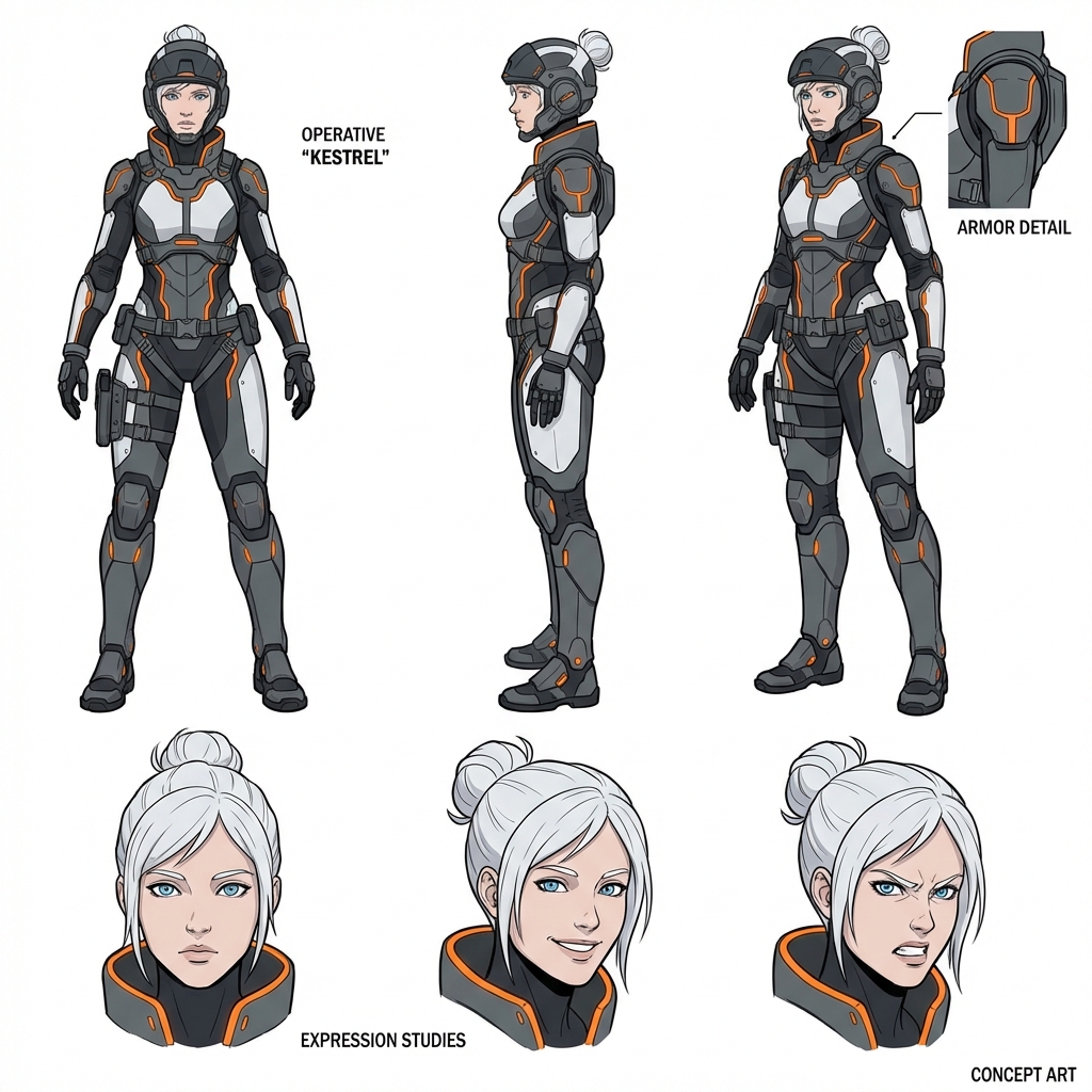 A professional character design sheet for a futuristic female operative. High-tech clothing with orange accents, white hair, blue eyes. The layout is a 2x3 grid. Top row: Full body front view, side profile view, 3/4 turn view. Bottom row: Close-up of face - neutral expression, smiling, angry. Clean lines, flat shading, white background. Concept art style. --ar 3:2